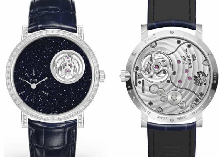 Από το 1874 ο ελβετικός οίκος Piaget δημιουργεί αριστουργήματα της ωρολογοποιίας που συνδυάζουν εξαιρετικά λεπτούς μηχανισμούς με πολύτιμα υλικά. Πιστός στην παράδοση αυτή παρουσιάζει το Altiplano Tourbillon στην περιορισμένη έκδοση των 38 τεμαχίων. Το γυναικείο ρολόι ξεχωρίζει για τα τοποθετημένα διαμάντια στη στεφάνη (και την κορώνα) και το καντράν αβεντουρίνης (μία ημιδιάφανη ποικιλία χαλαζία), που θυμίζει την απεραντοσύνη του έναστρου νυχτερινού ουρανού.