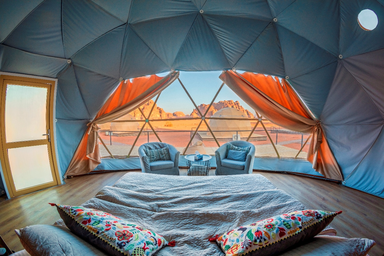 Στην εντυπωσιακή Ουάντι Ραμ της Ιορδανίας, οι επισκέπτες μένουν σε σκηνές βεδουίνων ή σε φουτουριστικές διαφανείς καμπάνες για να κοιμούνται κάτω από τα αστέρια. Με τζιπ, καμήλες, αερόστατα και πεζοπορίες στην έρημο, η εμπειρία μοιάζει βγαλμένη από άλλο πλανήτη.